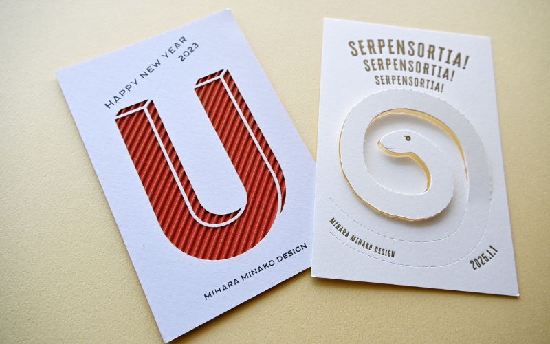 たとえば、2023年の年賀状は、おしゃれなダンボールみたいな「ファインフルート®」(竹尾)という紙を使い、表面を“U”の形にレーザーで焼き飛ばして、中の赤いフルート部分を見せるデザインです。加工もプロに依頼するなど、素材と技の融合を楽しめるようになっています。まさにパッケージデザイナーの三原さんならでは。