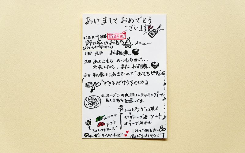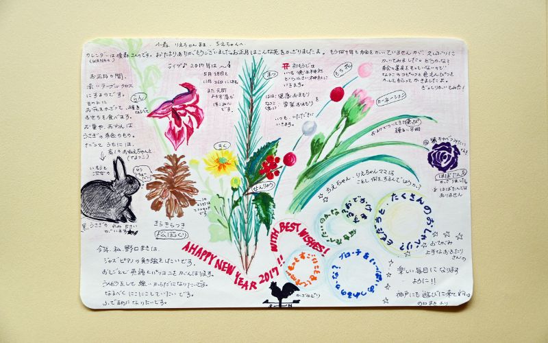 野口真紀さんの2017年の年賀状は、ハガキではなく、封書で届きました。A4サイズの紙に描かれているのは、野口さん宅のお正月のテーブル風景です。お正月飾りやお皿のまわりには、お正月の様子や今年の目標、初詣のことなどのエピソードが、まるでおせち料理のように並んでいます。