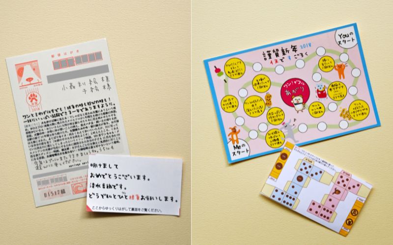 2018年の年賀状は「イヌですごろく」。戌年にちなんで、犬にまつわることわざや物語をモチーフにしたマス目になっています。宛名面には保護シールが貼られていて、めくると、そのマス目のもとになったことわざや物語の詳細が登場。さらに、その保護シール部分は、サイコロとコマをつくることができるキットになっているのです。清水さんと一勝負(犬だけに「わん!=one=1)できる、ユーモアたっぷりの一枚です。