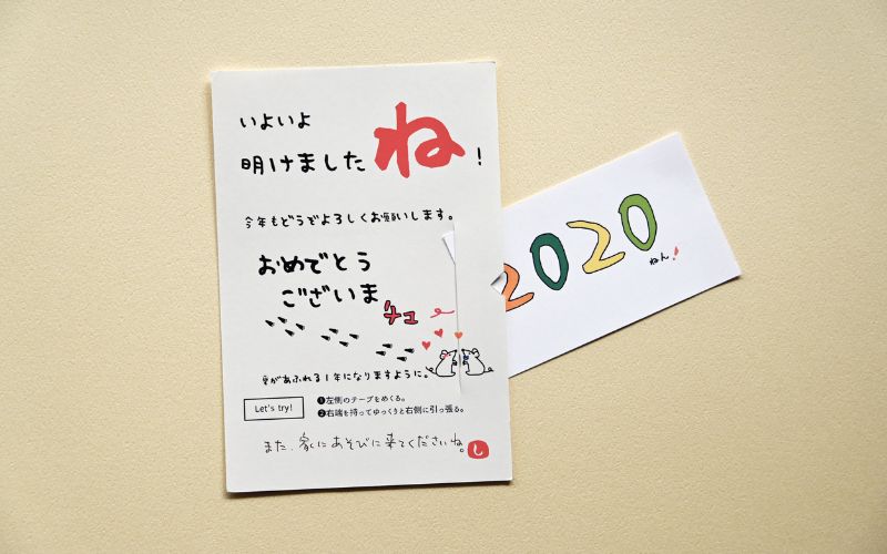 2020年の年賀状は、紙を引っ張ると「おめでとうございます」のメッセージが現れ、絵柄のねずみがカップルになる仕組み。受け取った相手が、自分の手を動かすことで完成するようになっていました。