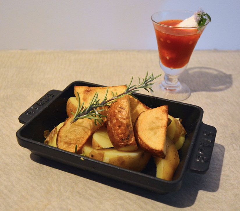 鰹、昆布、鯖、椎茸と共に低温調理の下処理をしたあとに揚げたジャガイモのフリット。天龍村の伝統野菜「十久保南蛮」の辛さを活かしたタイ風スイートチリソースとともに味わって。