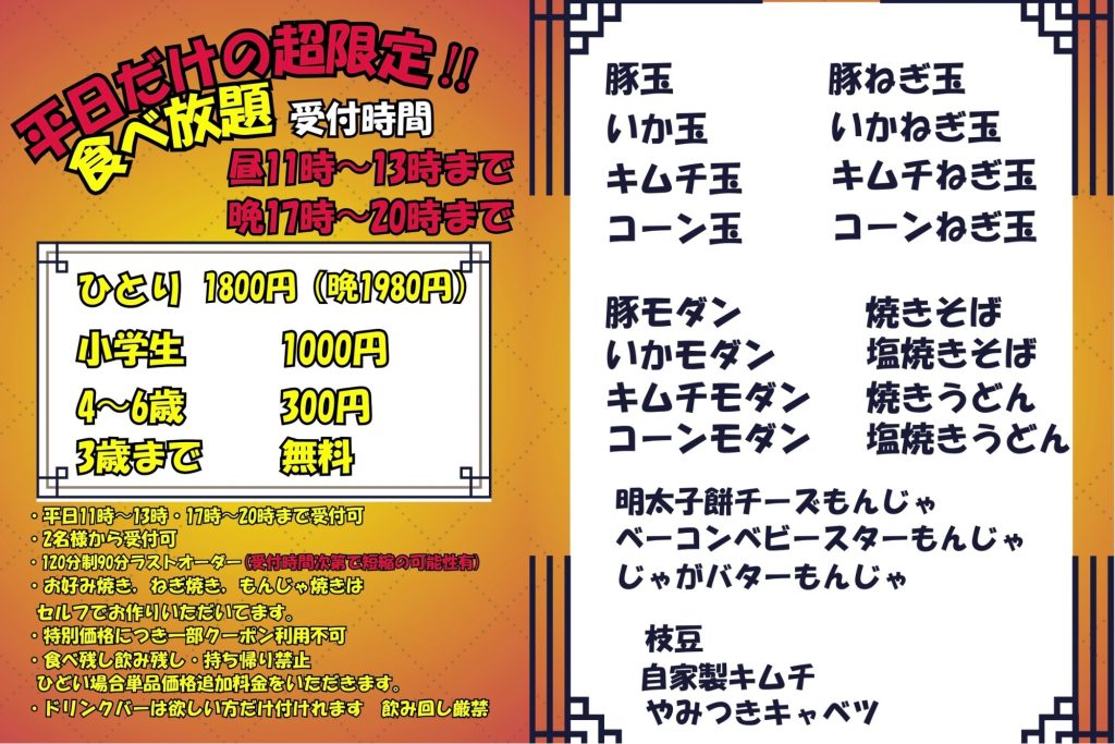 こちらが食べ放題メニュー。お好み焼き、モダン焼き、もんじゃ焼き、焼きそば、焼きうどんが食べ放題。120分制で90分ラストオーダーです。