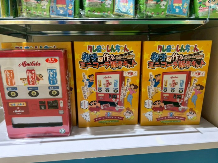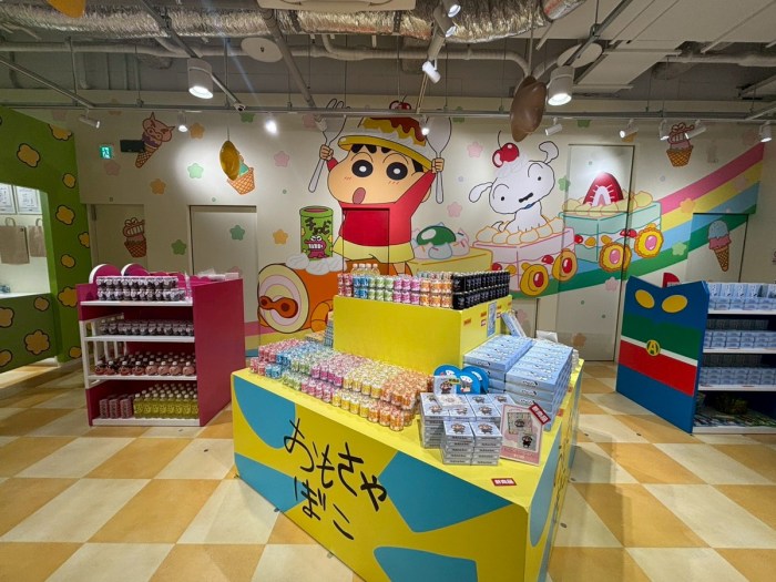 さらに商品陳列棚が「おもちゃばこ」ならぬ「おもさゃぼこ」になっていたり、スイーツ列車に乗ったしんちゃんと白の大きな壁画など、思わずニヤリとする仕掛けも盛りだくさん。