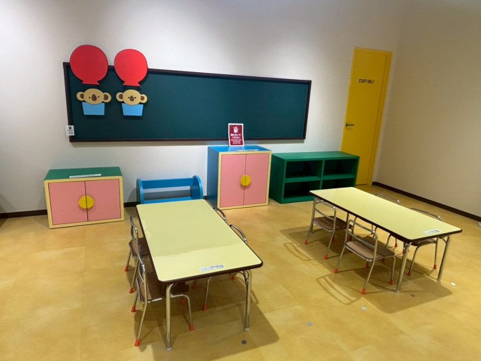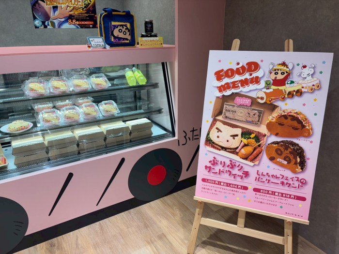 「ぶりぶりサンドウィッチ(1404円)」や「しんちゃんフェイスのパンケーキサンド(918円)」といったメニューを、しんちゃんが通うふたば幼稚園を再現したエリアで味わうことができる。(テイクアウト可)