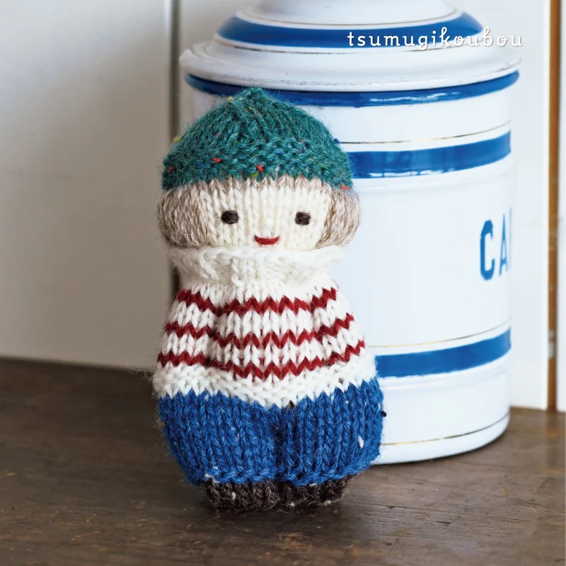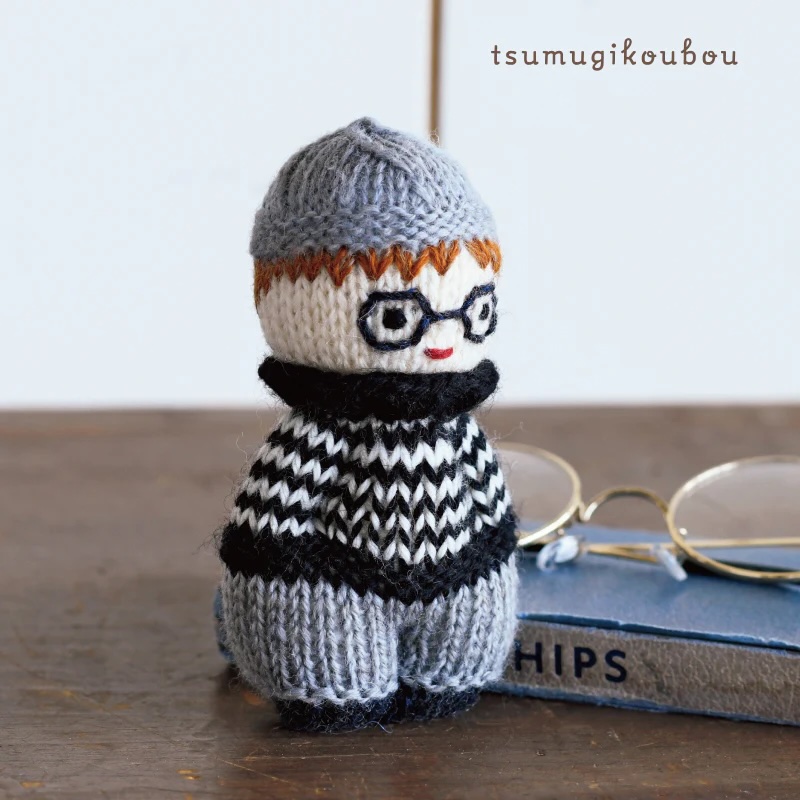 ボーダーのセーターとどんぐり帽子がおしゃれな男の子。黒縁メガネがトレードマークです。(税込2,970円/できあがりサイズ約13cm/編み方は『ツムギコウボウが編む 棒針編みのあみぐるみ』の本をご覧ください)