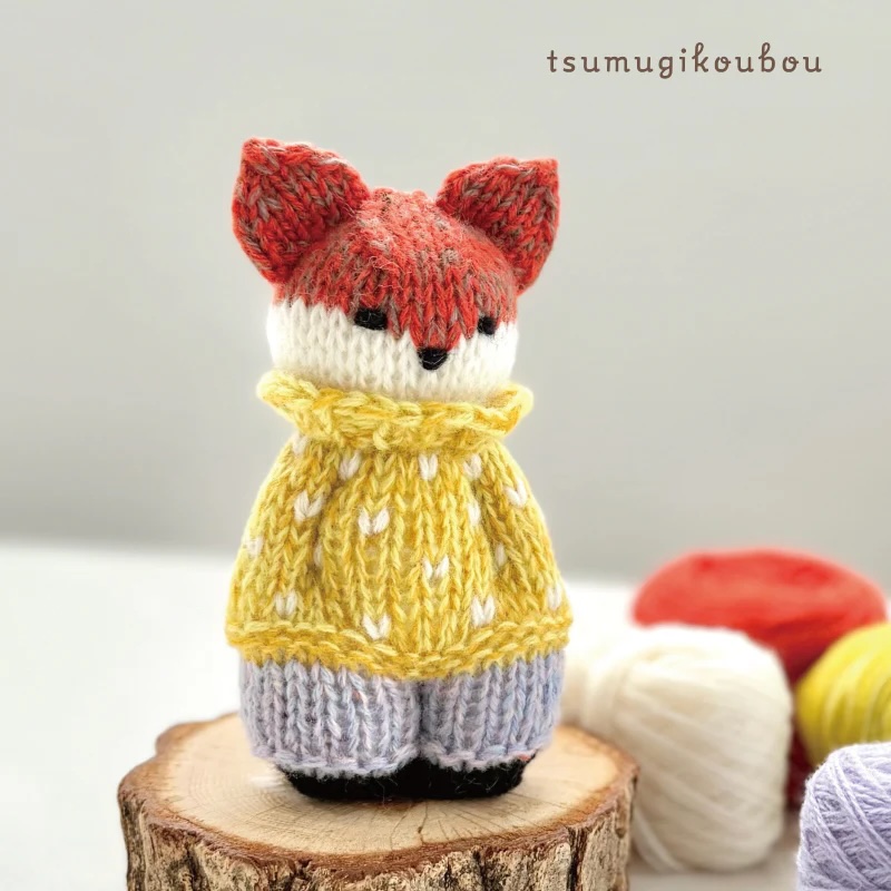 ドット模様の黄色いタートルネックセーターがお似合いのきつねさん。大きなしっぽも自慢なんだ。※こちらのキットに含まれる糸は、書籍掲載作品の糸とは異なります。(税込2,970円/できあがりサイズ約11.5cm/編み方は『ツムギコウボウが編む 棒針編みのあみぐるみ』の本をご覧ください)