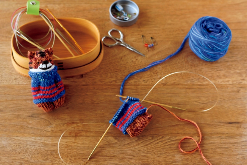 A:毛糸と手芸わたや副資材などが入っています。棒針(輪針)やとじ針などの用具は別途ご用意ください。