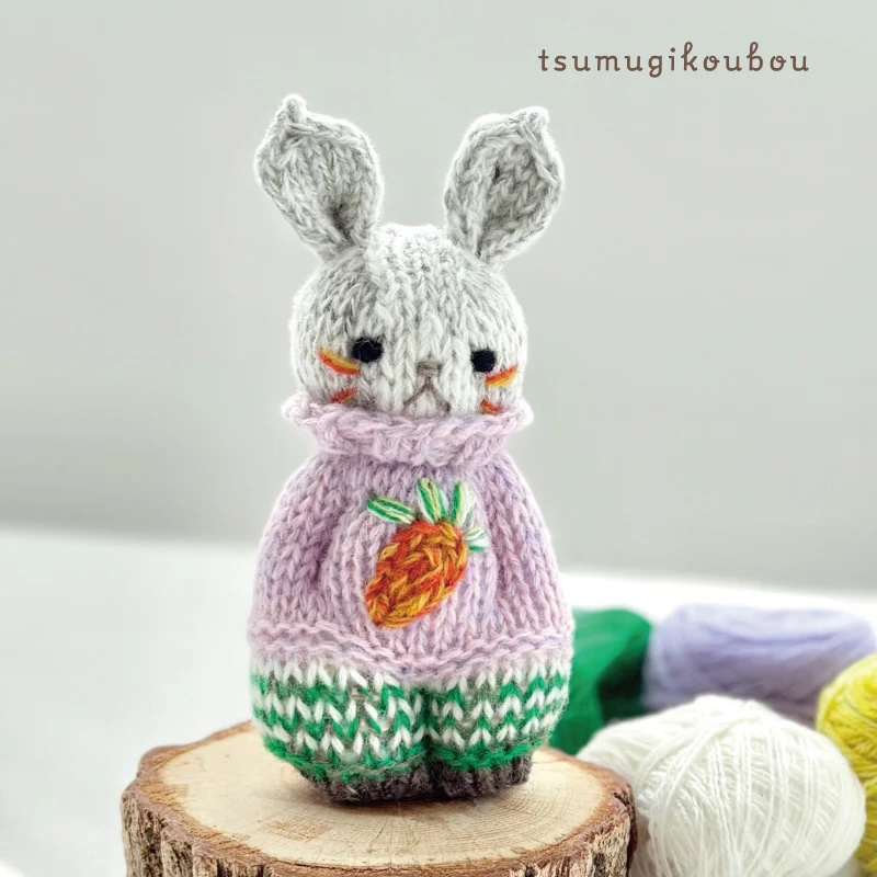 大好きなにんじんの刺しゅうが入ったとっておきのセーターで森へおさんぽ。ピンとした耳がチャームポイントです。※こちらのキットに含まれる糸は、書籍掲載作品の糸とは異なります。(税込2,970円/できあがりサイズ約13cm/編み方は『ツムギコウボウが編む 棒針編みのあみぐるみ』の本をご覧ください)