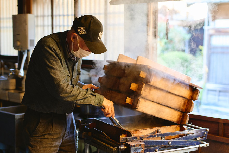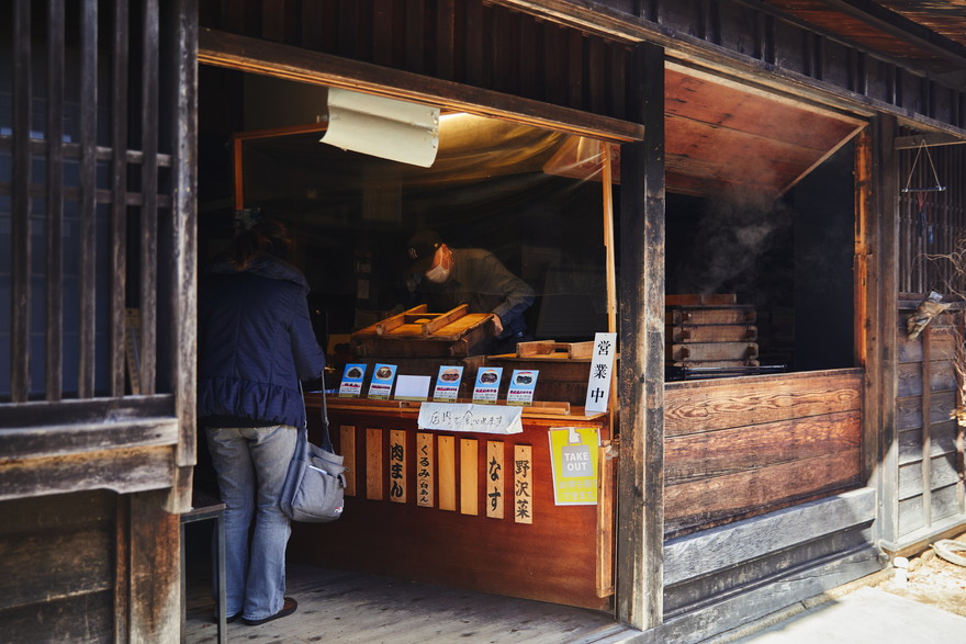 妻籠宿を散策していると、どこからか良い香りとモクモクとした煙が…。香りと煙につられ、ふらりと向かった先にあったのが、人気のおやき店「わちのや」です。店頭では肉まんと、4種類のおやきを販売しています。