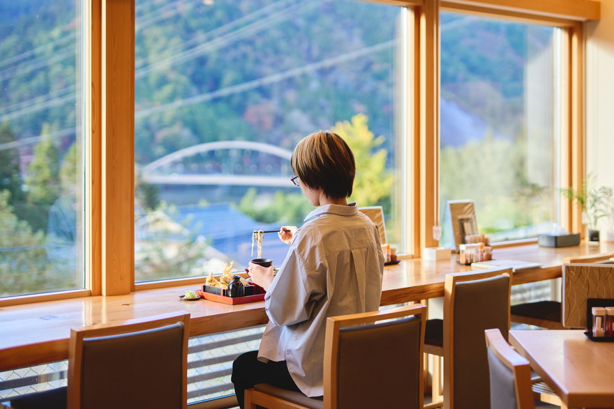 店内は約4年前にリニューアルし、大きな窓も設けられました。目の前に広がる大桑村の美しい景色を眺めながら、ゆったりとそばを楽しめます。席は、テーブル席とカウンター席、座敷席を用意。1人でも、家族・グループでも様々なシーンにおすすめです。