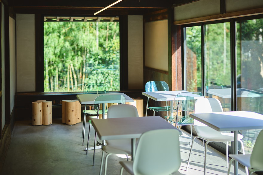 カフェの店内。大きな窓からは、すぐそばに広がる山林が絵画のよう。