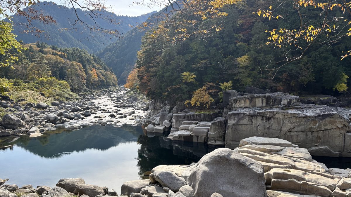 上松町の寝覚の床では、水面に景色が映り込んでうっとりするような風景に感動。時間を忘れるような穏やかな空気が広がります。