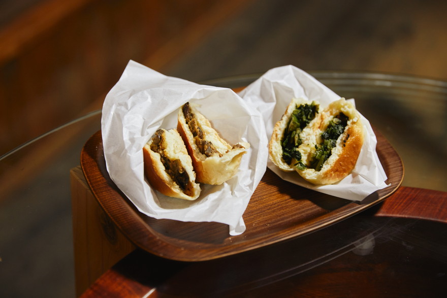 野沢菜のおやきは1本ずつ丁寧に洗った野沢菜を調理し、たっぷり詰め込んでいるのが特徴。もちっとした生地と野沢菜のシャキシャキ感のバランスが良く、総菜パン感覚でぺろりと食べられます。