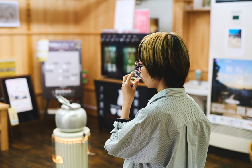 観光案内所の一角に設けられているだけあって、付近にはテーブル席やベンチも多数。気になるお酒を、座って心ゆくまで楽しめます。