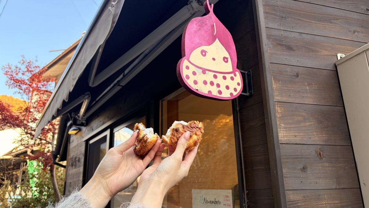 王滝村にある菓子店「ひめや」では、人気のシュークリームを実食。かわいらしい看板にもほっこり癒されました。