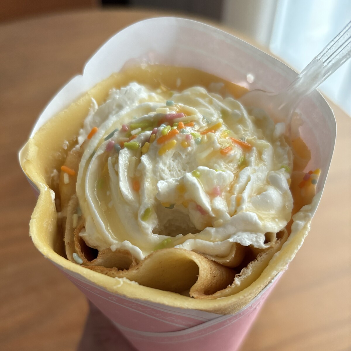この時期に食べたくなる、深川産の無添加加工のりんごを使った、りんごのクレープ(560円)は生地はもっちり、中にはたっぷりのコクのある生クリームや、甘酸っぱいりんごがゴロっと入っていて、甘いりんごソースもかかっていてさっぱりとしたクレープです。