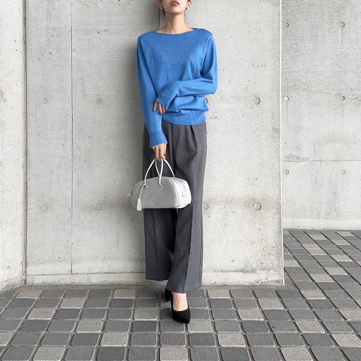 グレーパンツと同じ寒色系のブルーのニットを選ぶとダサ見えしないので、参考にしてくださいね。