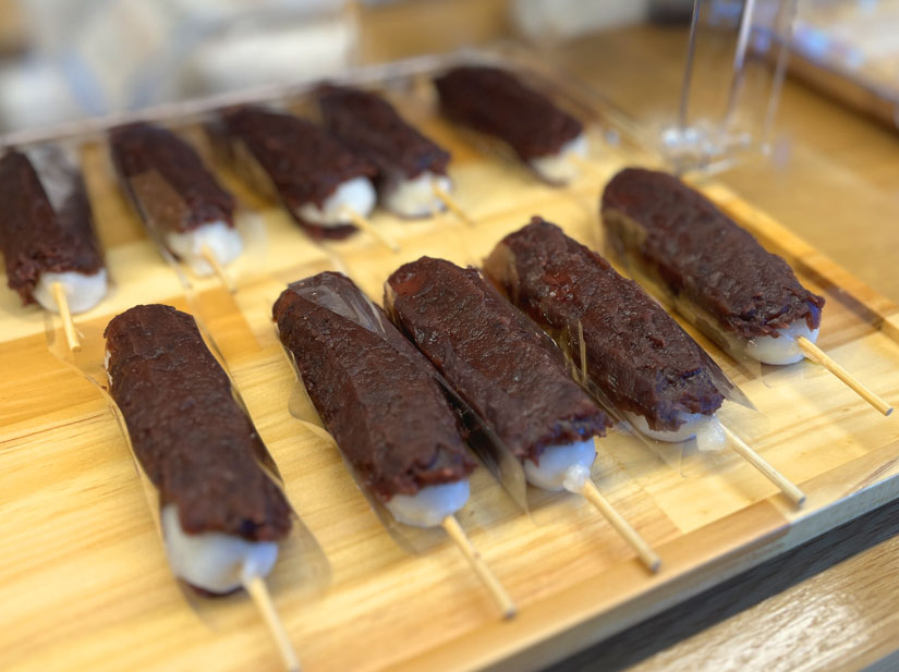 パン屋の一角にある「八十八だんご」。好きなお団子をセルフでとってパック詰めできます。