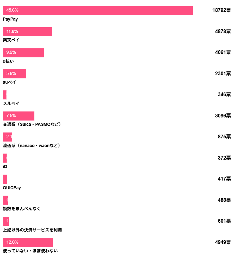 アンケートの結果、最も利用者が多かったのは「PayPay」で、全体の45.6%を占めました。圧倒的な支持を集める理由は、使える店舗の多さと利便性にあるようです。