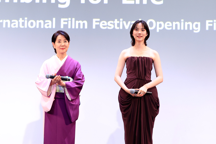 阪本順治監督は「本日は東京国際映画祭のオープニングにお越しいただきありがとうございます。スマホやPCの画面ではなく、大きなスクリーン、迫力のある音響でご堪能ください」とあいさつ。吉永小百合、のんも東京国際映画祭のオープニング作品の上映に足を運んでくれた観客に感謝を示しあいさつ。田部井淳子さんがモデルの多部純子を演じられたことについて聞かれると吉永は「田部井さんには2012年にお目にかかっていて、それ以来明るく積極的で生き生きとした彼女のファンでした。山には20代の頃によく登っていました。本作で富士山やそのほかの色々な山に登って、大変では?と聞かれますが、とても幸せな時間でした」とコメント。多部純子の青年期を演じたのんは共演シーンは無かったものの、オールアップの時にプロデューサーらに止められながらも、吉永が一人で現場に来てくれたことを回顧し「富山の山での撮影で、駅からも離れていて来にくい場所だったんですけど、サプライズで吉永さんが現場にお1人で駆けつけてくださり喜びでいっぱいでした」とコメント。吉永とのんが同一人物を演じることについて2人にアドバイスしたことを問われると阪本監督は「田部井さんの本や出演されていたテレビを見て、キャラクターを箇条書きにしてお2人に伝えました。あとのんさんには吉永さん昔の映画を観てもらいイメージをつかんでもらいました」と役作りの裏側を明かした。
