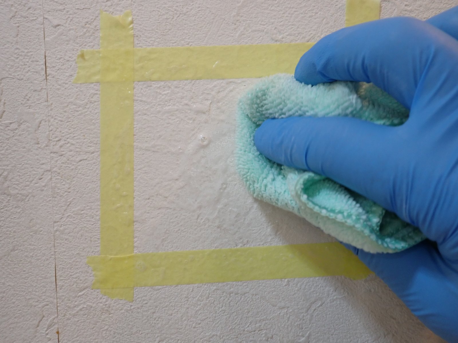 今回の掃除方法は、ビニールクロスを対象としています。そのため掃除できる壁紙か、必ずチェックしてください。その際は、目立たない場所でテストすること! ビニールクロスと紙クロスの見分け方は、霧吹きで水をかけて「水を弾くかどうか」で判断できます。水を弾く場合はビニールクロス、水を吸い込む場合は紙クロスです。写真のように水を弾いていればOKです!