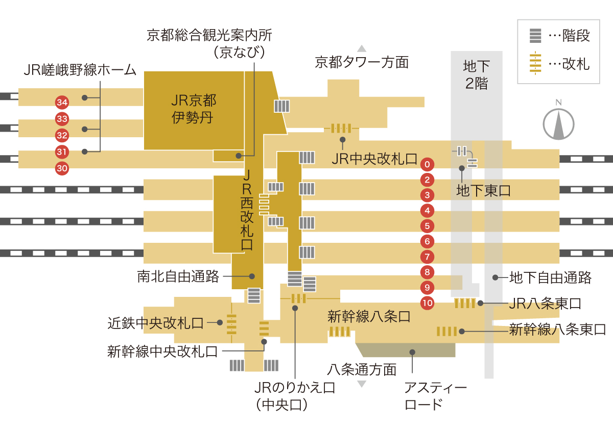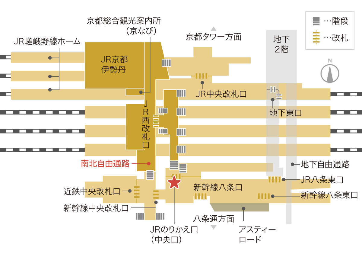 広くて人も多い京都駅では、今、自分が何階あたりにいるのか、どこが地上なのか、意識が向きづらいもの。そんな時に思い出してほしいのが「地下鉄は地下にあり!」です。特に在来線を使って京都駅へ来た場合は、各ホームから地下へ下りる階段があるので、上り階段と下り階段があったら迷わず下りを選ぶと好アクセス。「地下出口」から出ると、地下鉄の「中央1改札口」「中央2改札口」がすぐそばにあります。また、改札を出て地下鉄のりばを探し歩くより、できるだけ改札内の連絡通路を利用して目指した方が近道です。