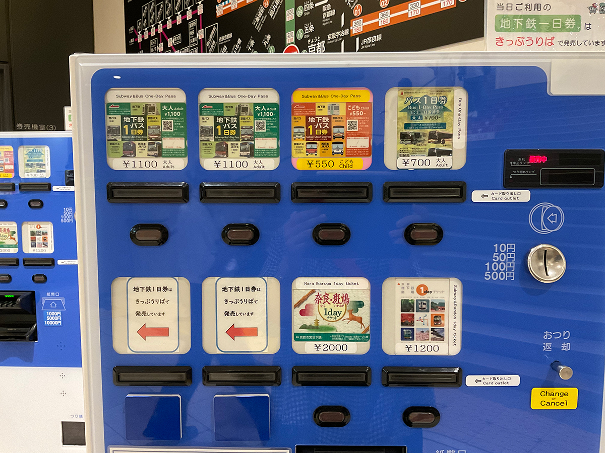「地下鉄・バス1日券」は、京都駅ビル2階の南北自由通路(改札外)にある「京都総合観光案内所(京なび)」や、バス総合案内所、バス停や地下鉄乗り場に設置された自動販売機、などで販売中。大人は1,100円、子どもは550円です