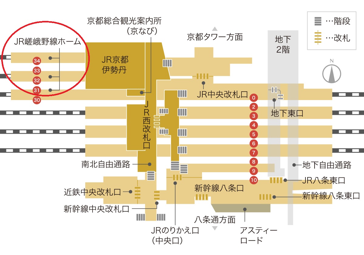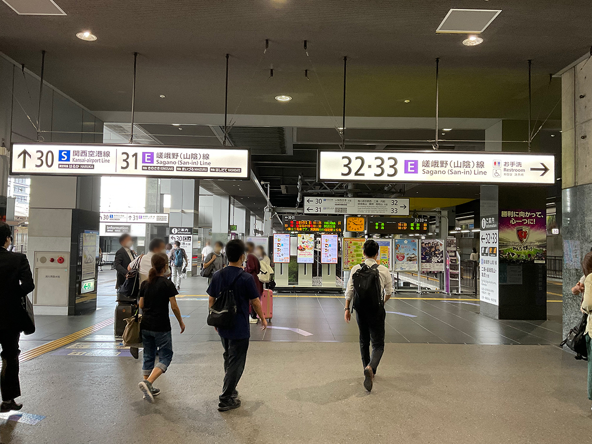 30番以降の嵯峨野線(山陰線)は、嵯峨嵐山駅方面へ行く路線。しかし、そのホームは他の路線からは、やや遠いところにあります。