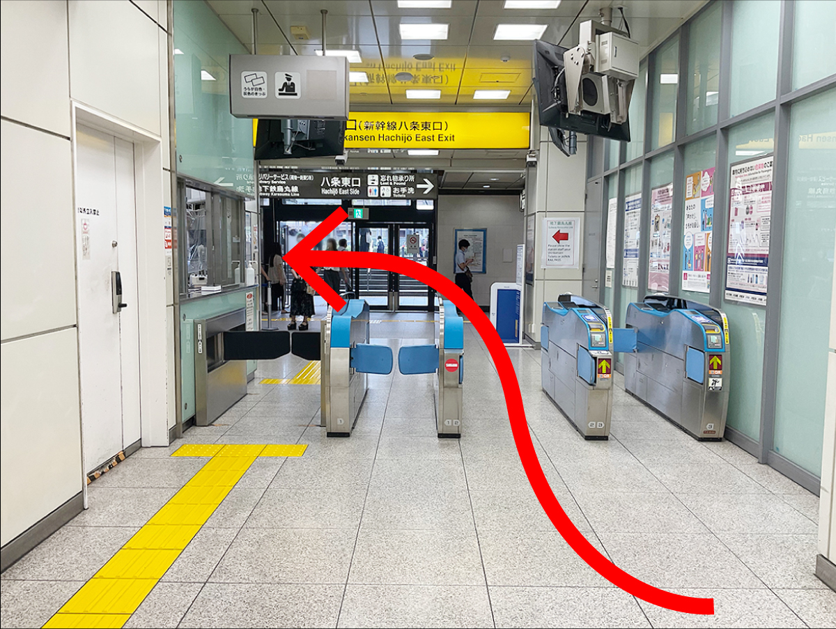 ②は同じく新幹線コンコースの奥にある「八条東口」を出て左へ進み、ファストフード店から左方向へと曲がり、さらに地下へ降りていきます。