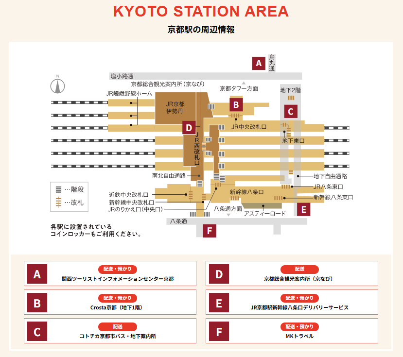 そんな時は京都駅にある荷物預かりサービスや、宿泊先などに送るサービスを利用すると大変便利です。京都駅に到着してすぐに大きな荷物から解放!足取りも軽やかに目的地を目指すことができます。