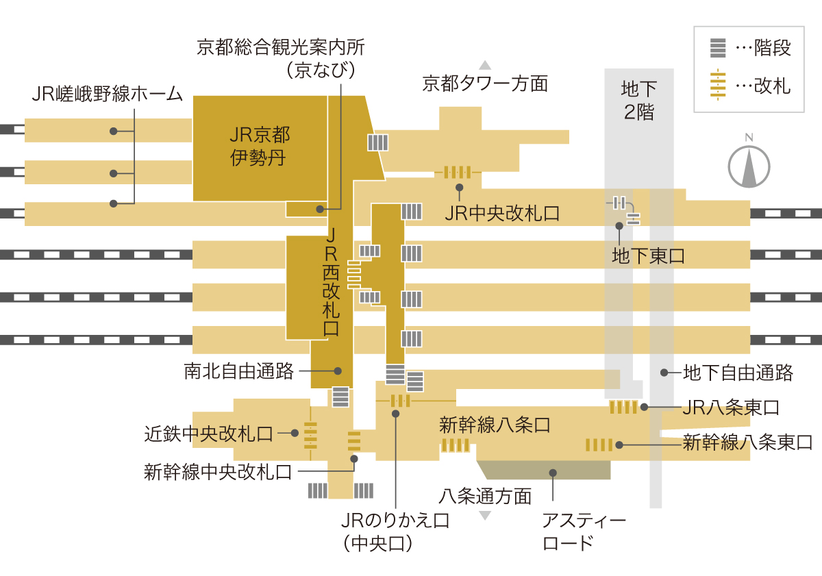 京都の玄関口として知られる京都駅は、日々、多くの利用客を誇る日本有数のターミナル駅。公共交通機関で訪れた観光客が最初に降り立つ場所であるとともに、徒歩圏内にホテルや商業施設などもあり、毎日多くの人が行きかいます。ただし、ちょっぴり複雑なつくりで、ともすれば地元の人でも迷ってしまうこともしばしばです。