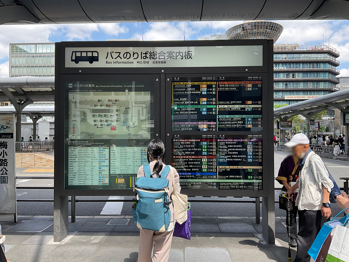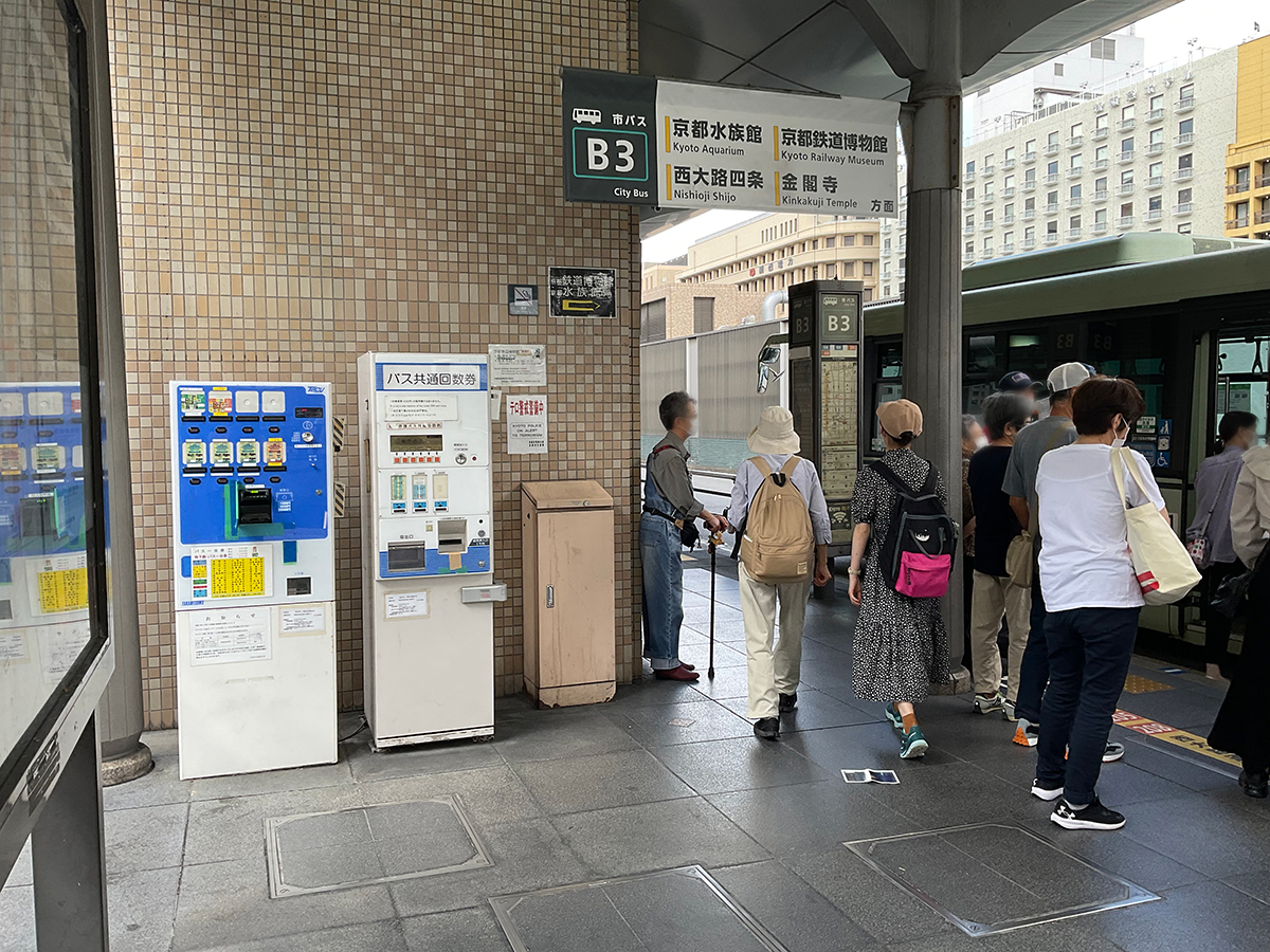 バス乗り場は、京都駅「中央口」を出た正面。ニデック京都タワーのお膝元にあります。カーブしている白っぽい屋根が目印です。南側の「八条口」にもバス乗り場はありますが、高速バスや空港バス、ホテルのシャトルバスなどが多いです。