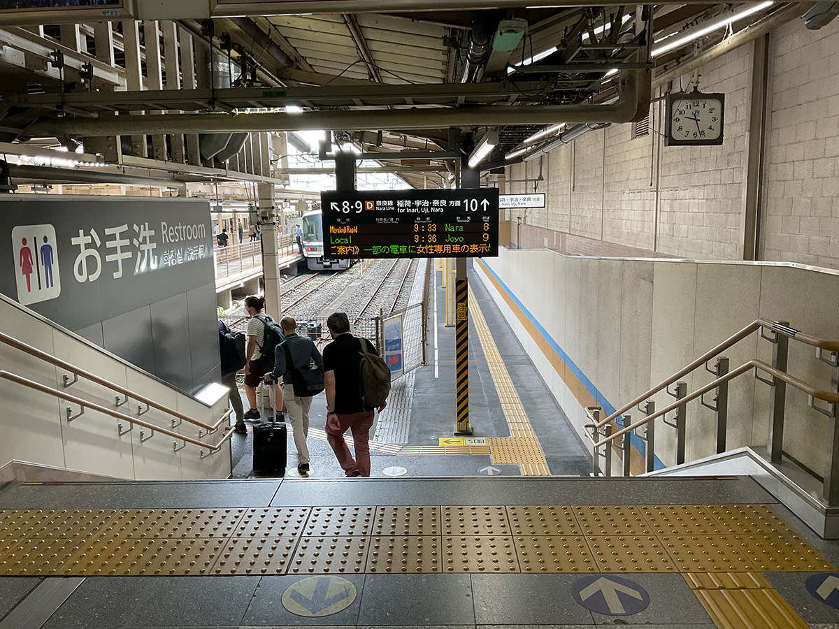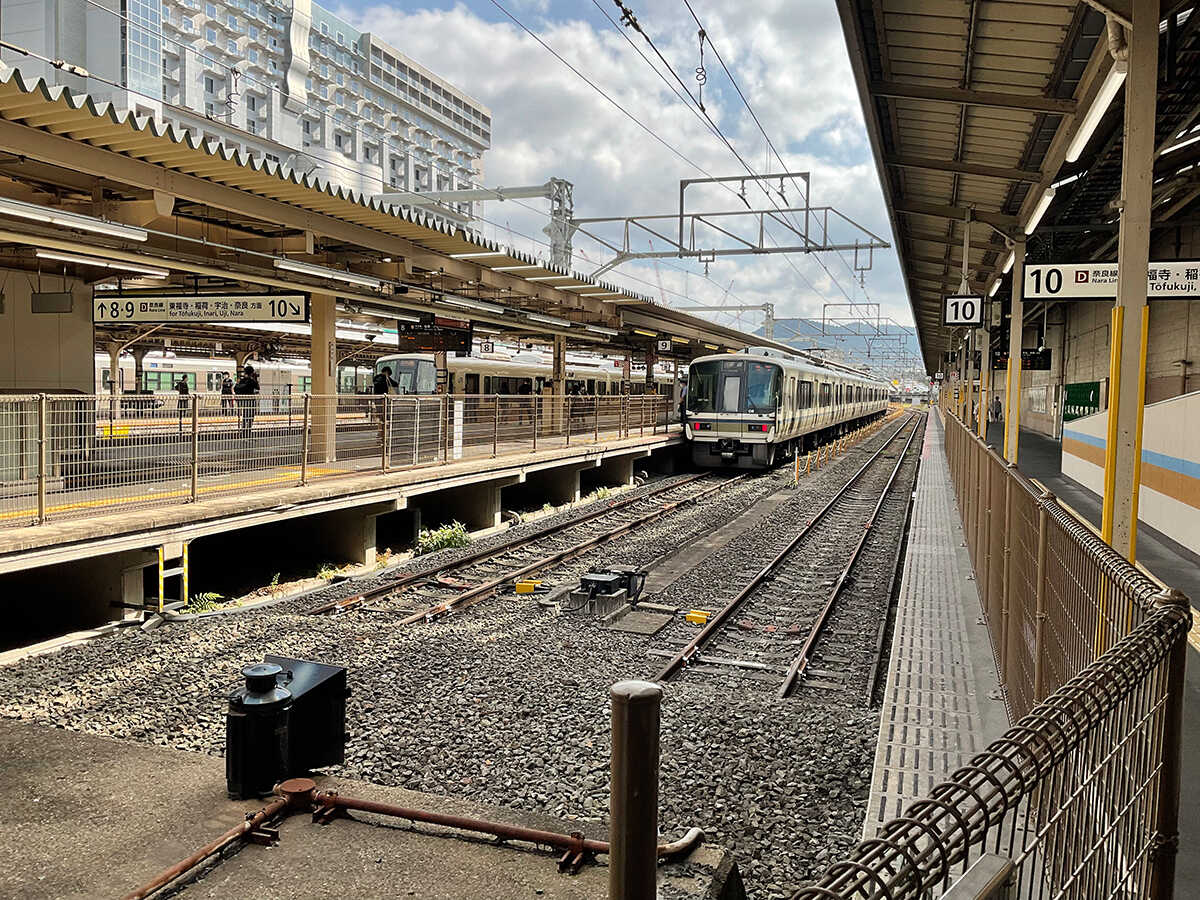 新幹線のコンコースから「JRのりかえ口(中央のりかえ口)」を出るとすぐ右手にあるのが8・9・10番ホーム、JR奈良線です。伏見稲荷(最寄りは稲荷駅)や宇治方面や、京阪線への乗り継ぎに利用されています。