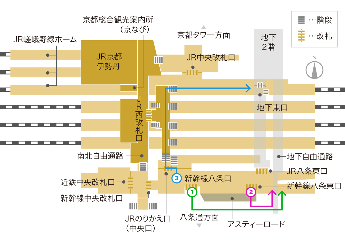 ①と②は途中から合流し、地下鉄烏丸線京都駅の「南改札口」にたどり着きます。