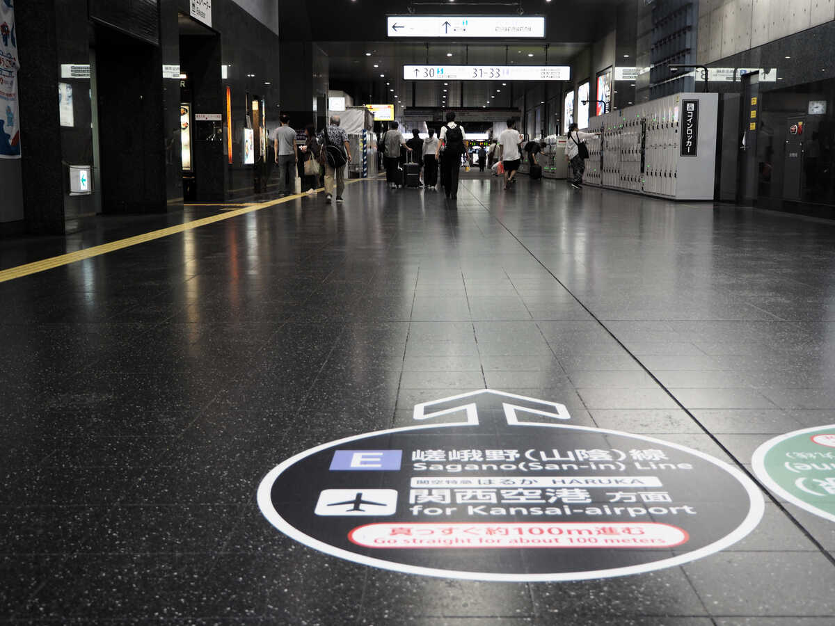一部の通路では、30番以降の嵯峨野線(山陰線)・関西空港方面の方向を示す黒色のステッカーが貼られていますので、こちらも参考にしてください。