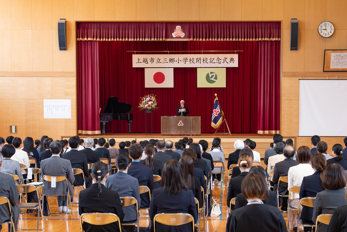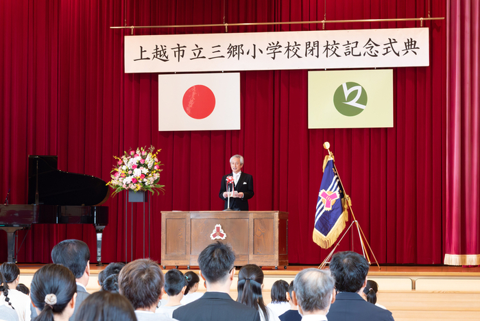 上越市主催の式典には約190人が出席し、佐藤吉弘校長が「三郷小は開校当初から、地域文化の中心や住民の融和の拠点として常に地域から手厚い支援をいただいてきた。152年の歴史に幕を下ろすが、子どもたちは三郷の地で学び体験したことを胸に新しい環境でも立派に活躍してくれると確信している」とあいさつした。