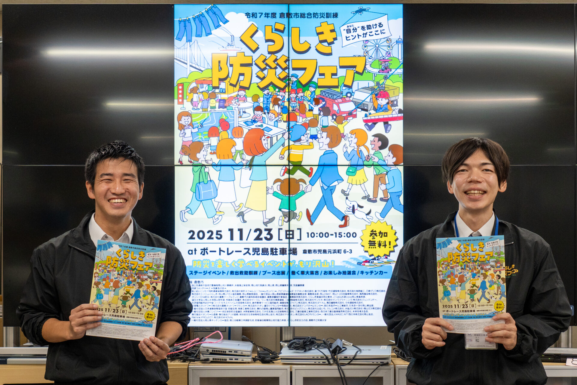 「くらしき防災フェア」を企画・運営する倉敷市 防災危機管理室 地域防災推進課の眞野健太(まの けんた)さん、松岡耕亮(まつおか こうすけ)さんにお話を聞きました。