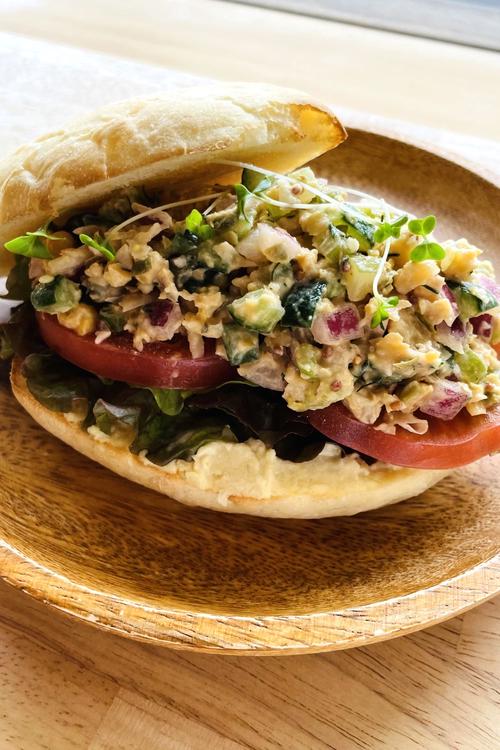 良質なたんぱく質やビタミン、ミネラルを豊富に含むひよこ豆をメインに、きゅうりやセロリ、紫玉ねぎを豆乳マヨネーズのドレッシングで和えた一品です。ヘルシーで栄養価も高く、美容や健康を気にする方にぴったりのサンドイッチです。