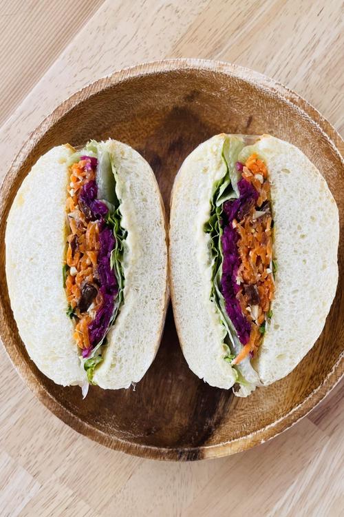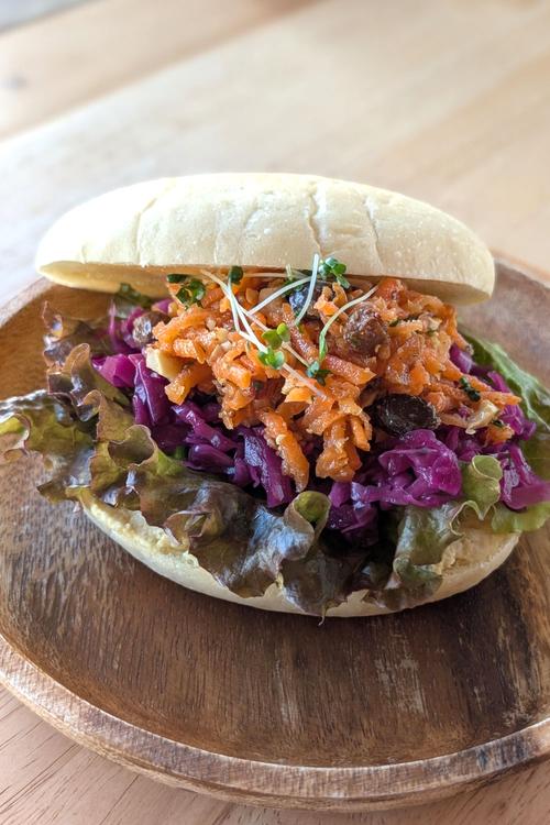 こだわりのフォカッチャに、千切り人参をビネガーで爽やかに味付けした絶品キャロットラペがみずみずしく挟まれています。レーズンとナッツがほど良いアクセントとなり、甘みと食感が絶妙に調和。シャキッとしたサニーレタスと紫キャベツが重なり野菜の旨味を実感しました。