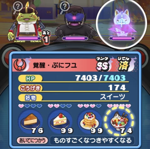 覚醒・ぷにフユこの好物はスイーツです。好物を与えて、なつき度を上げましょう。