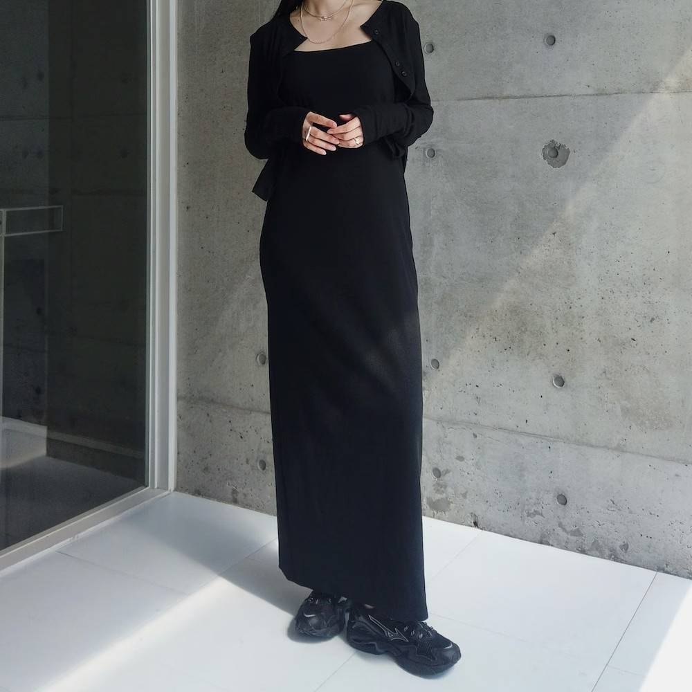 黒ワンピースの上に黒カーディガンを羽織ったオールブラックコーデのときは、足元のスニーカーも黒を選ぶのが正解♡