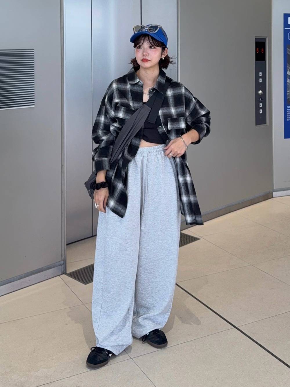 ルーズなシルエットのチェック柄シャツにスウェットパンツを合わせたカジュアルコーデは、今っぽいうえに動きやすい一石二鳥なスタイル!