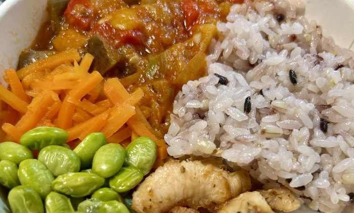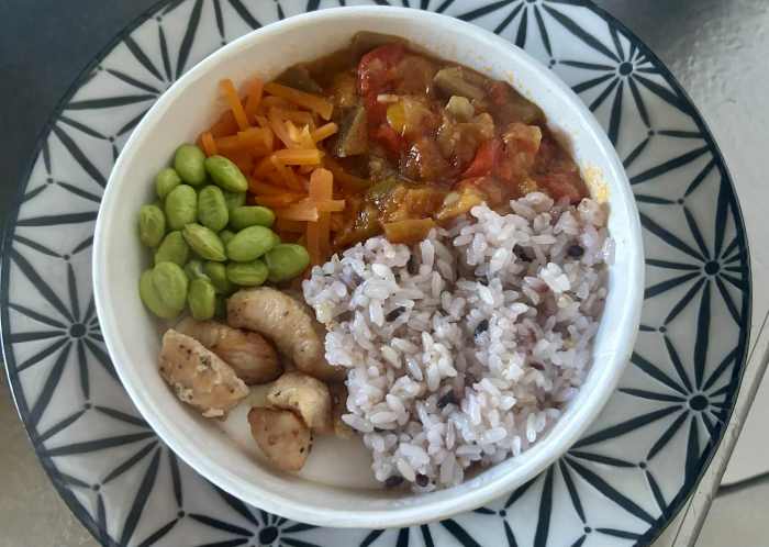 次に「ラタトゥイユとペッパーチキン」だ。こちらも先ほどの鶏肉同様に、しっとりとしていて固めの肉。ラタトゥイユは野菜の旨味十分で、濃いめの味付けなので、米と一緒に食べるのにちょうどよい。