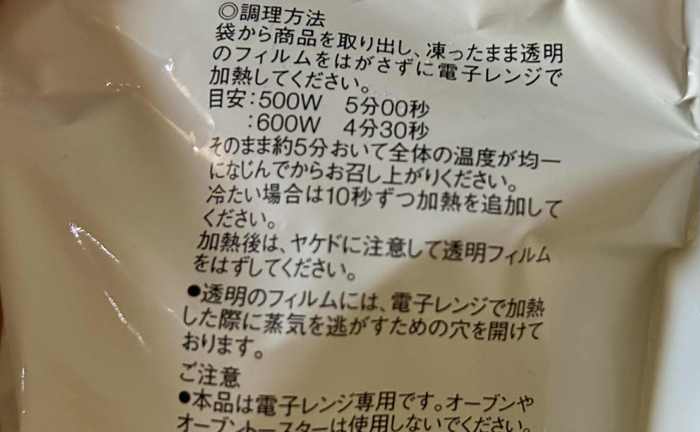 袋に記載されている温め方によると、いずれも500Wで5分、600Wで4分30分レンチンすればOKとのこと。そこまでは想定内だが、続く一文が想定外だった。「そのまま約5分おいて全体の温度が均一になじんでからお召し上がりください」という。