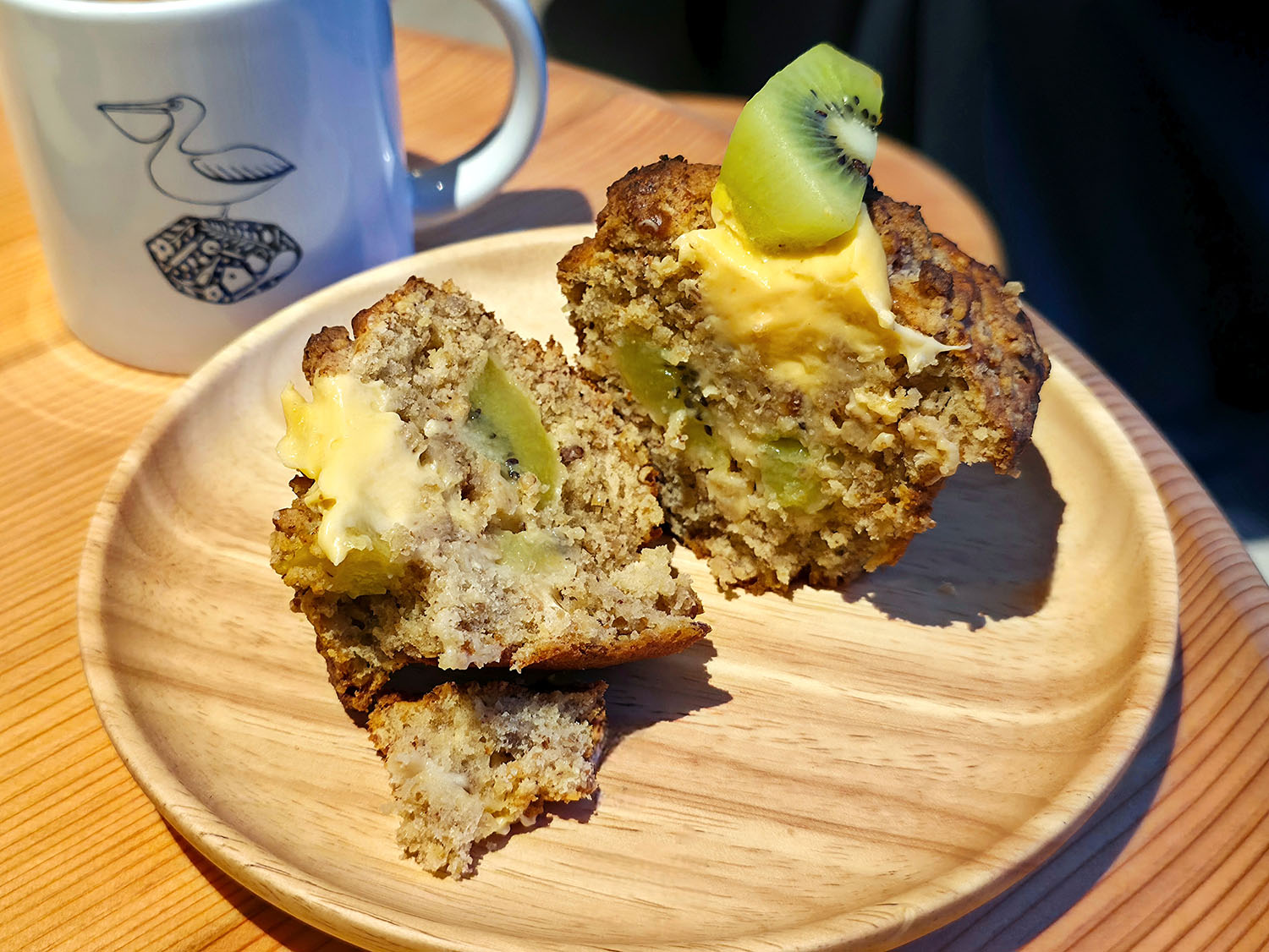 しっとりとしたマフィンに、カスタードクリームのやさしい甘さとキウイの酸味がよいアクセントになってウマウマ倍増にゃー♪