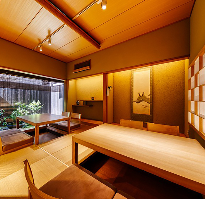 出町柳駅から車で10分、銀閣寺や哲学の道にほど近い【日本料理 藤井】は、和の風情が漂う日本料理店。京町家を改装した店内は、街の喧騒を忘れる落ち着いた空間になっています。4名用のテーブル席完全個室は、和モダンな雰囲気。8名の個室として利用できる掘りごたつ式の座敷は、京都らしい純和風の設えです。