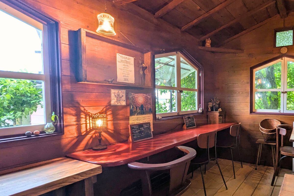 ツリーハウスを思わせる可愛らしい店内は、ガラスのモビールや小瓶に生けられた草花、手作りのオブジェなどがセンス良く飾られており、温かく居心地の良い雰囲気。 席数は、テーブル2席と、カウンター窓際のカウンターのみです。