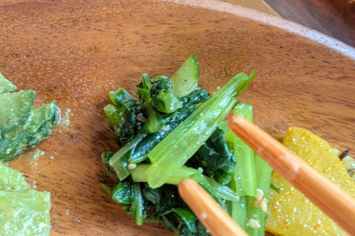 優しい梅の香りをまとったナスの揚げ浸しの上には、ごま油と塩味を効かせたオクラのナムル。 はじめにオクラの香りと塩味が、後からナスのほのかな酸味が追いかけてくる味の変化が楽しめます。オクラ特有の食感も、良いアクセントになっています。
