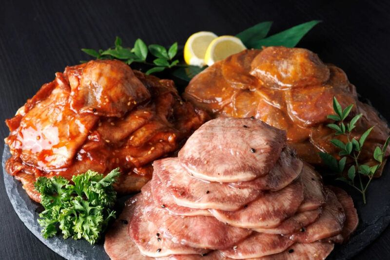 3種類の味付け「焼肉だれ」「味噌だれ」「塩だれ」から選べる牛タンは程よい厚みとコリコリとした食感、噛むほどに広がる旨みが特徴。味付け済みで調理も簡単なので、家庭でも手軽に本格焼肉が味わえます。
