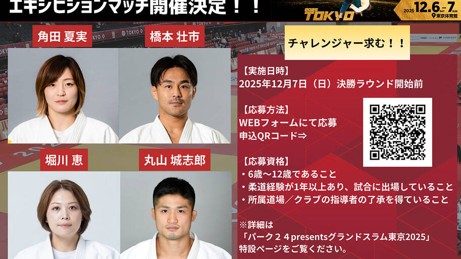 大会2日目の決勝ラウンド開始前に、「メダリスト×キッズ柔道家」のエキシビションマッチが実施される。角田夏実選手らメダリストと対戦する柔道キッズを募集中だ。
